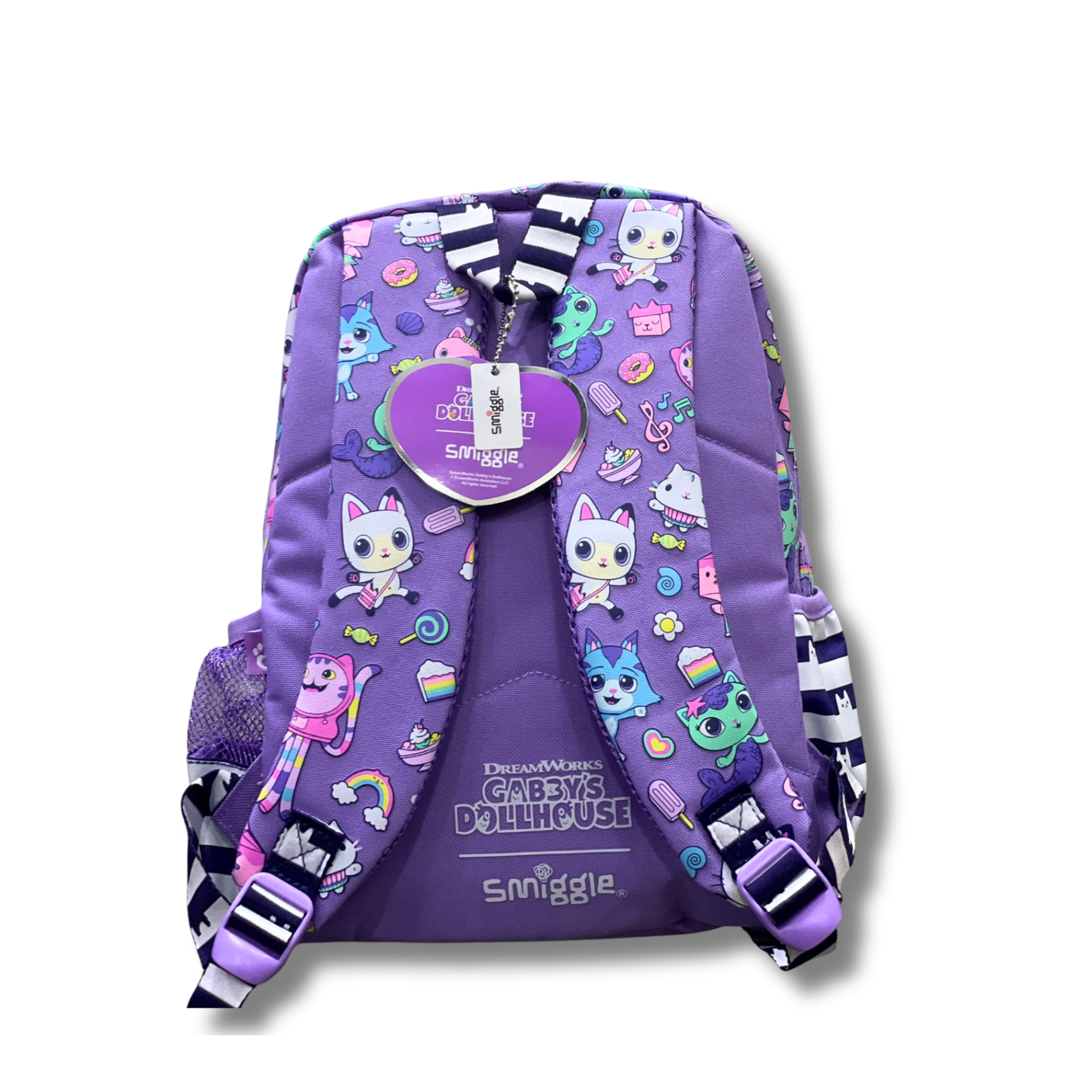 Make school days magical with this adorable 14-inch Smiggle Kitty Rainbow House Backpack! Featuring 3D window flaps, a cute kitty door, rainbow roof, and playful purple design – perfect for little girls who love fun, color, and imagination.