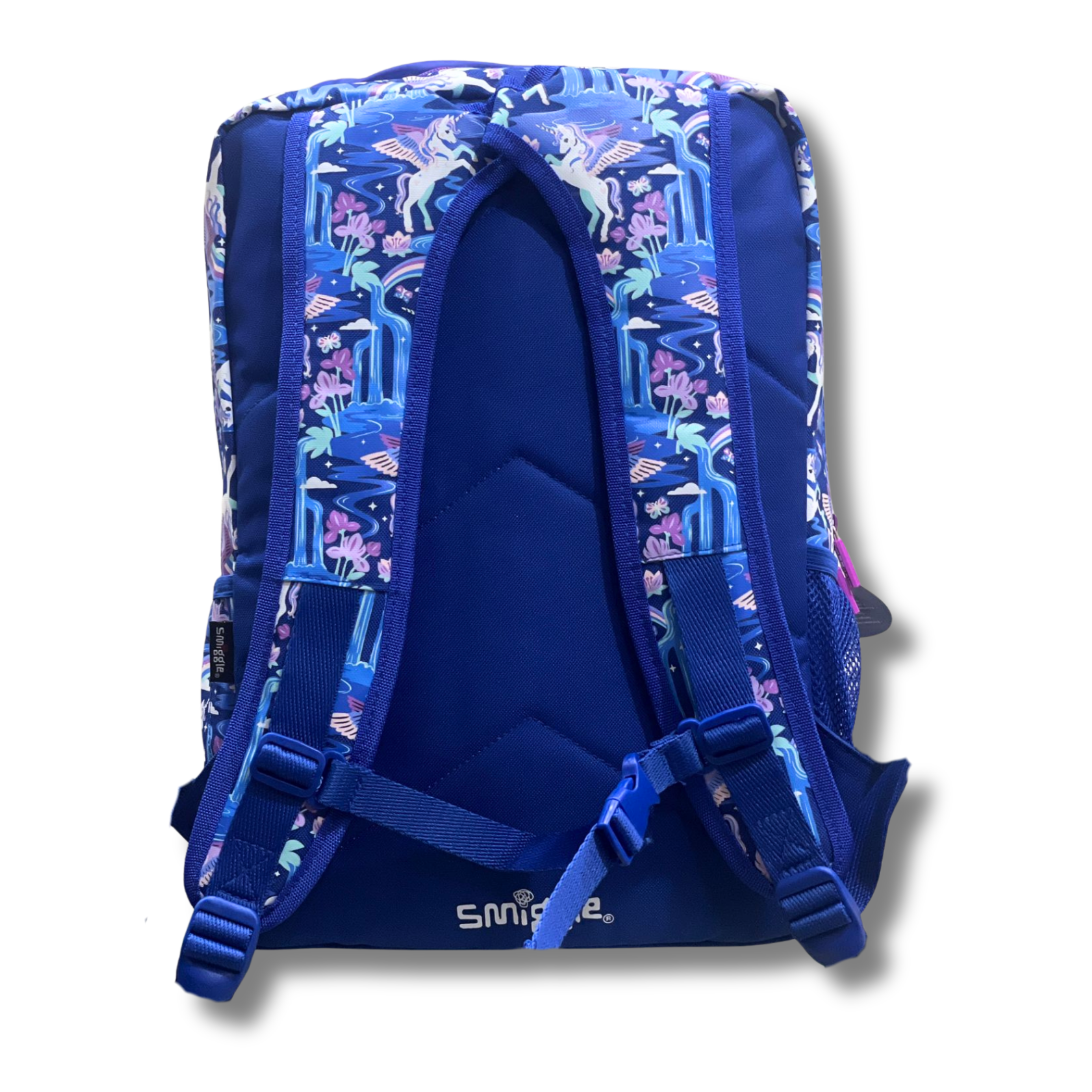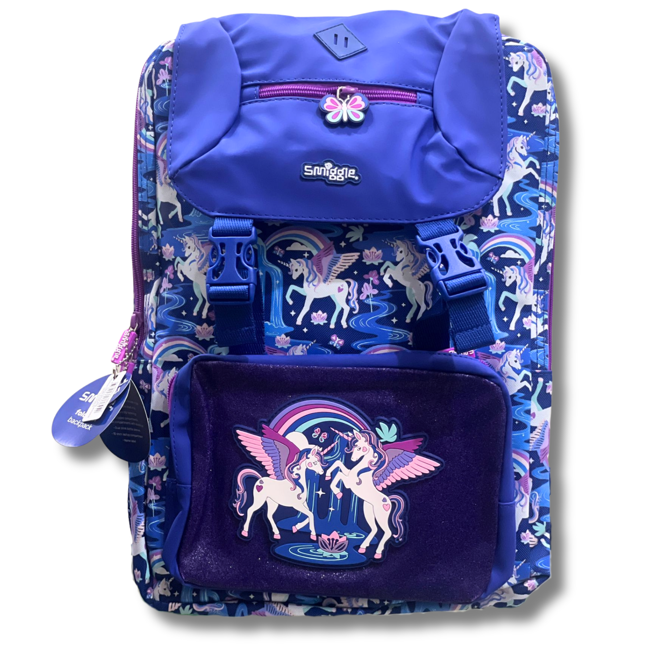 Step into a world of fantasy with this beautiful Smiggle Magical Unicorn Backpack! Featuring a stunning purple theme, elegant unicorn illustrations, and a sparkling velvet front pocket, this 18-inch backpack is perfect for girls who adore magical creatures and vibrant colors. Designed for comfort and style, it offers plenty of space for school essentials while adding a touch of enchantment to every day.