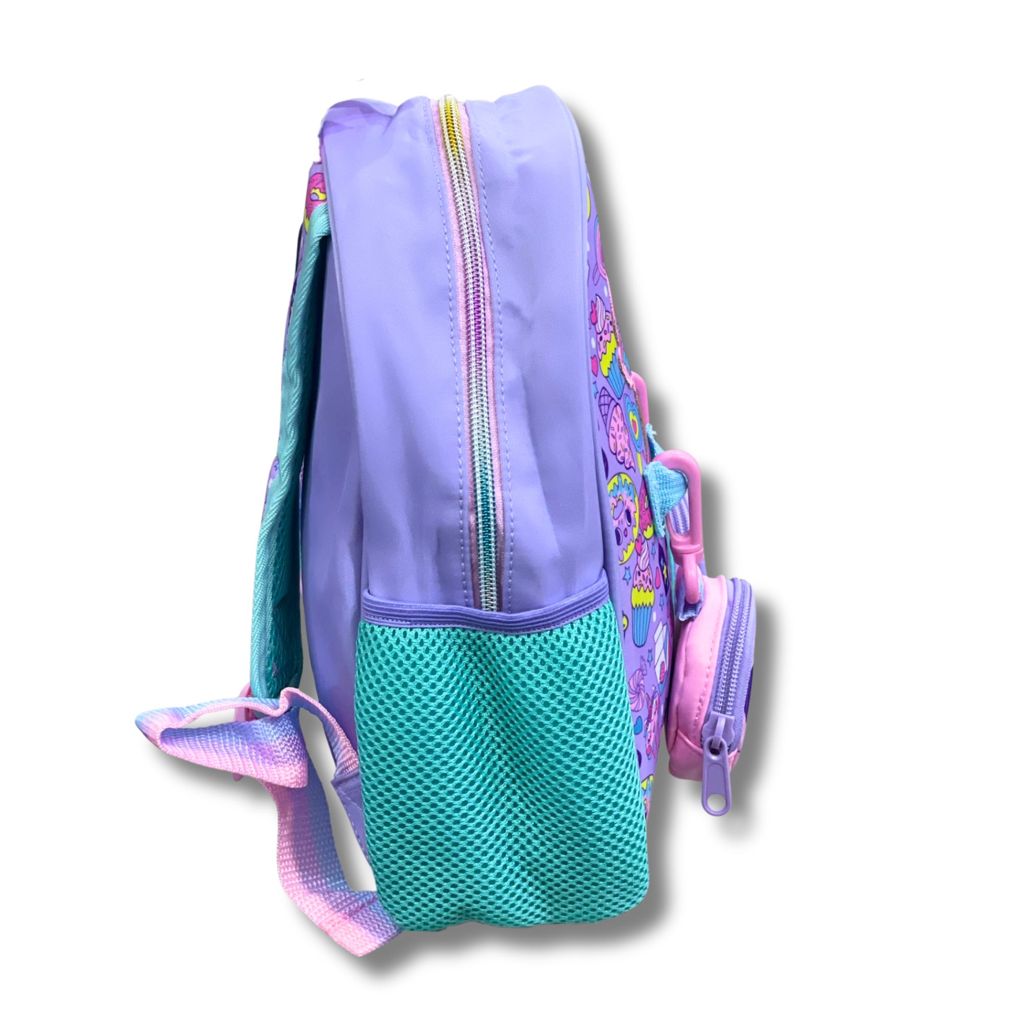 Featuring adorable cupcake characters, bright pastel colors, and two mini round pockets, this lightweight 11-inch bag is perfect for snacks, toys, bottles, and all daily essentials. A fun and cheerful pick for little girls!