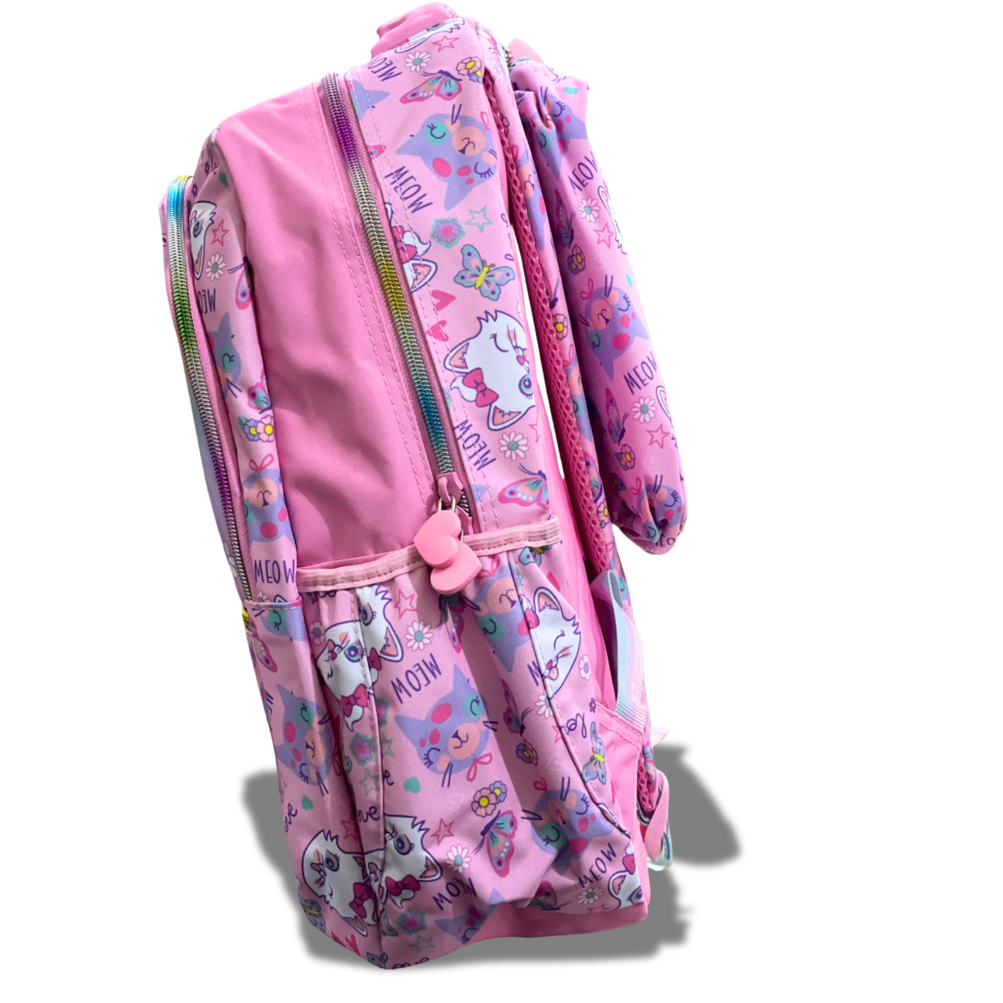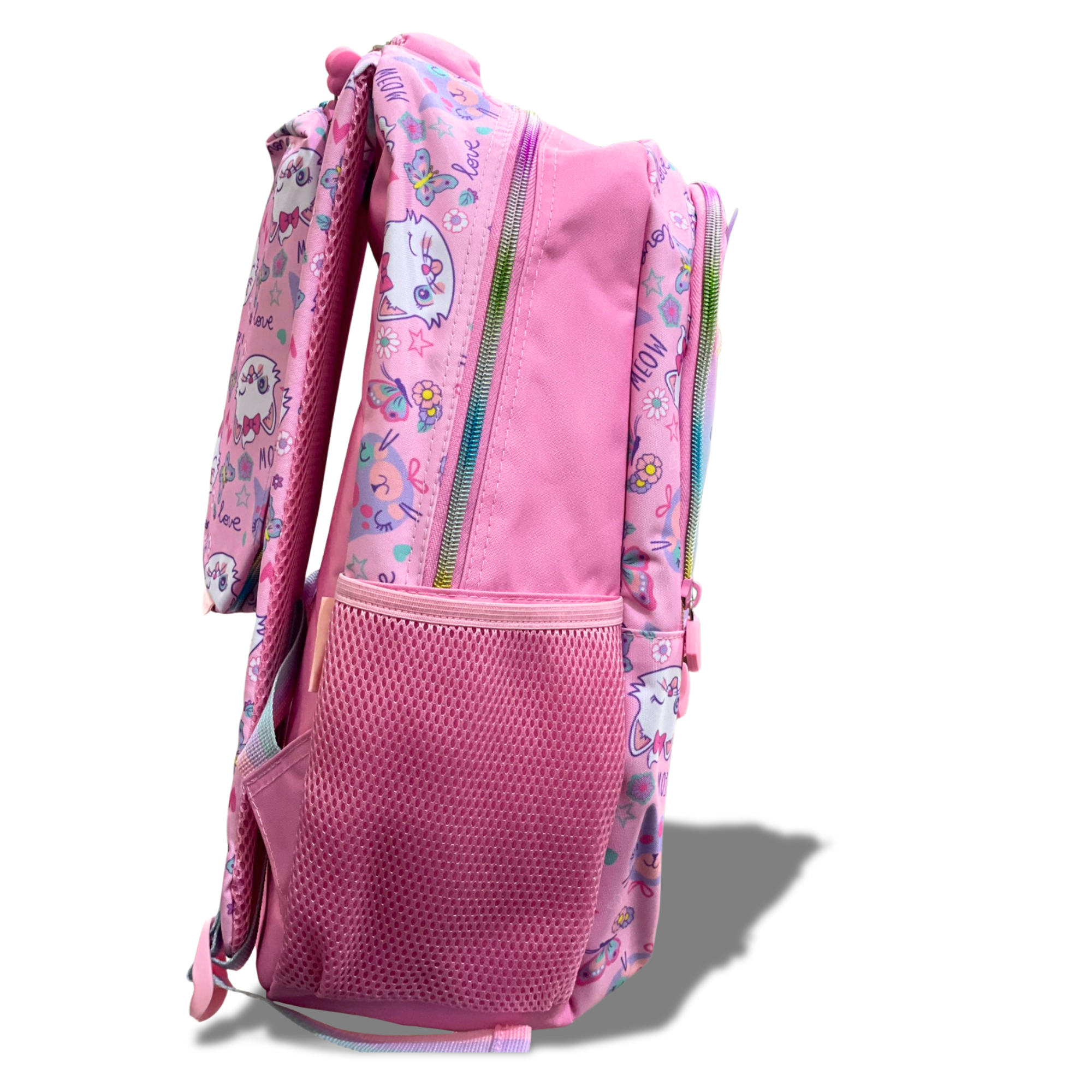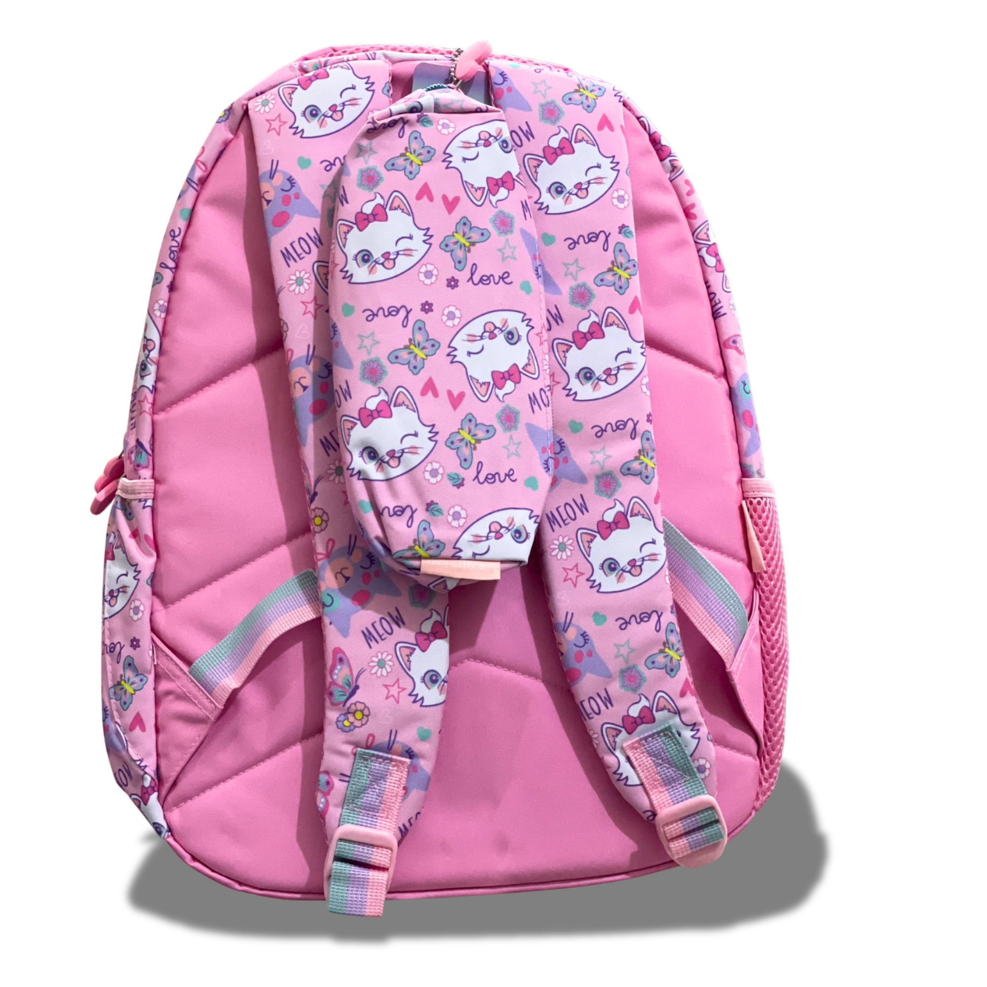 Featuring a sweet kitty graphic, sequined bow, colorful butterflies, and a customizable name tag, this spacious school bag offers comfort, style, and practicality all in one. Perfect for books, lunch boxes, and daily school essentials.